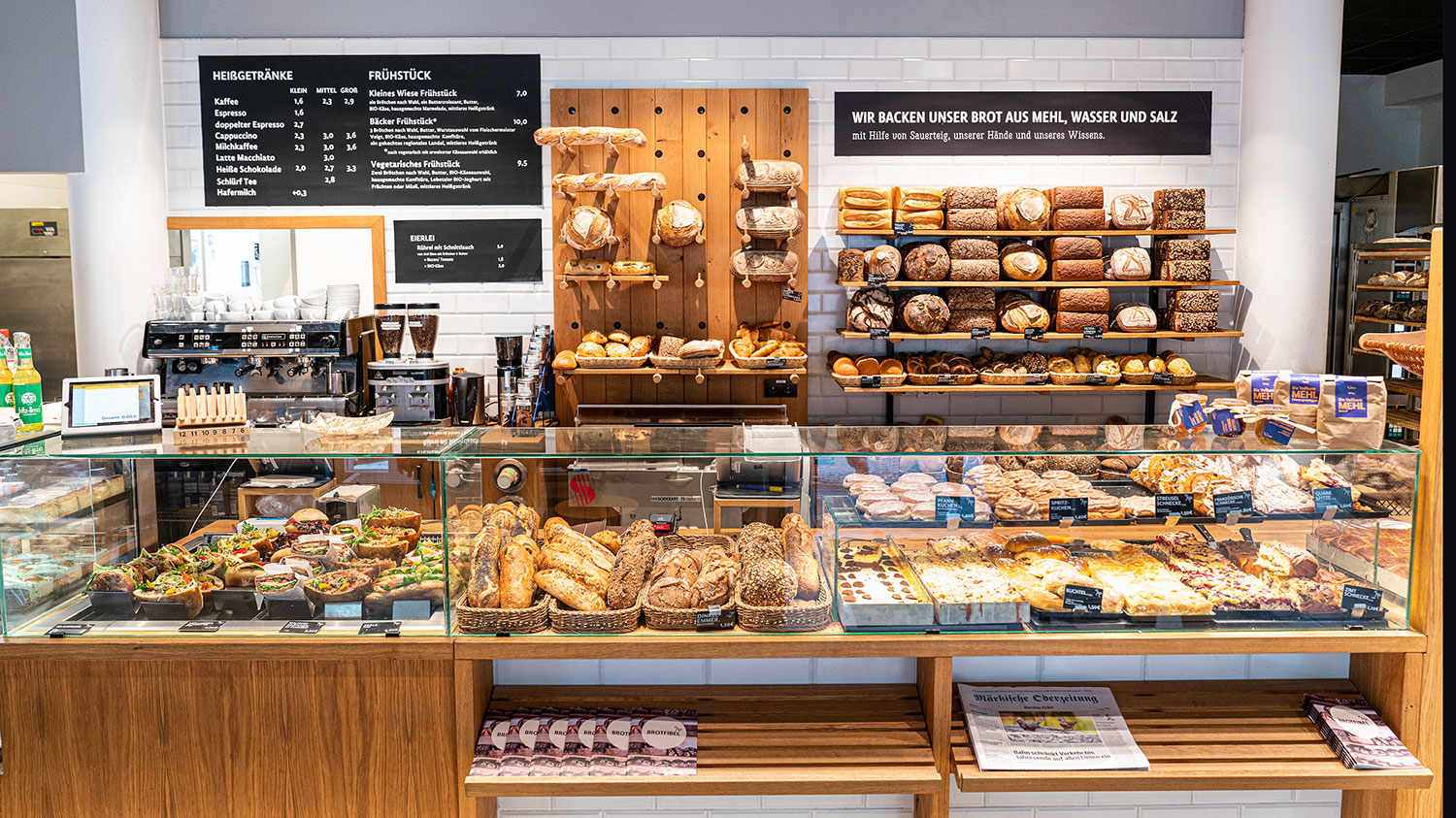 Wem nicht nach Reden zumute ist, der kann unseren Bäckern hinter der Glaswand beim Backen zusehen. Das ist wie fernsehen. Und gleichzeitig wirkt es beruhigend, echte Handarbeit zu beobachten. Mittagstisch und Imbiss-Angebot wechseln täglich. Natürlich gehören auch belegte Brote und Brötchen dazu.